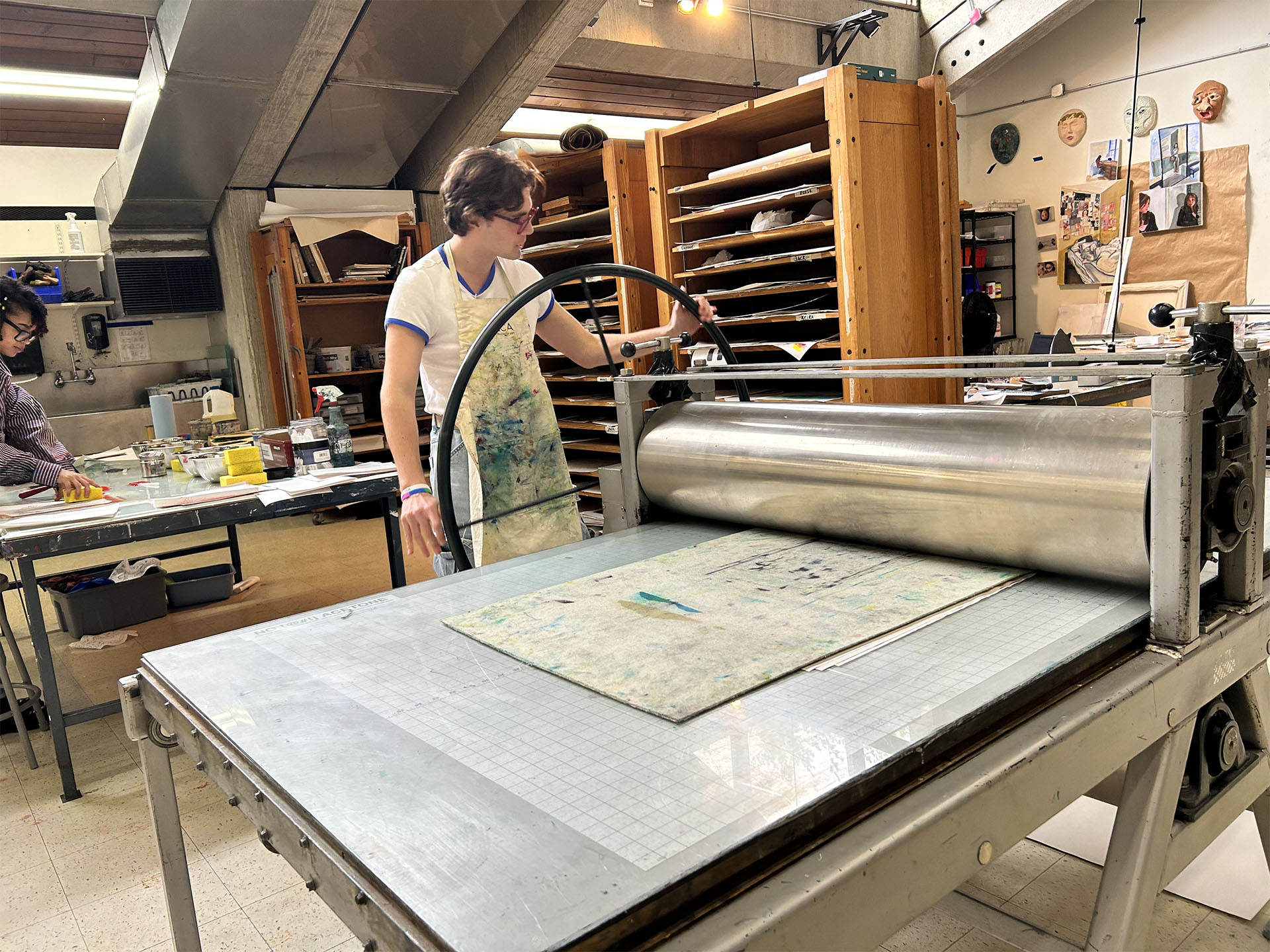 My classroom/printmaking studio at Milton Academy with large Takach press, smaller etching press on wheels, and exposure unit for screenprinting.