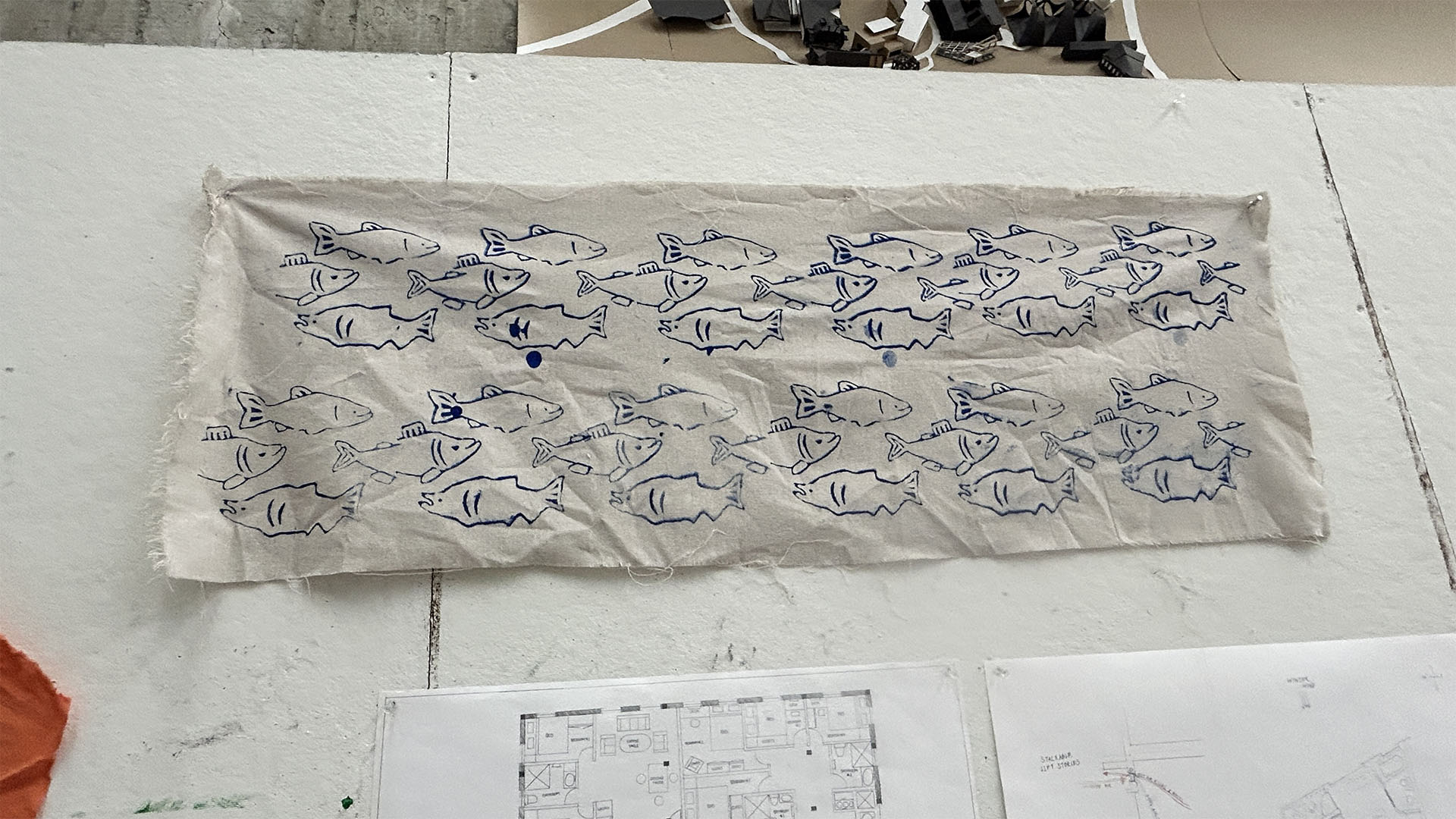 Example of printmaking being incorporated into other arts courses; this is a repeat pattern screenprint done in the Textile course.