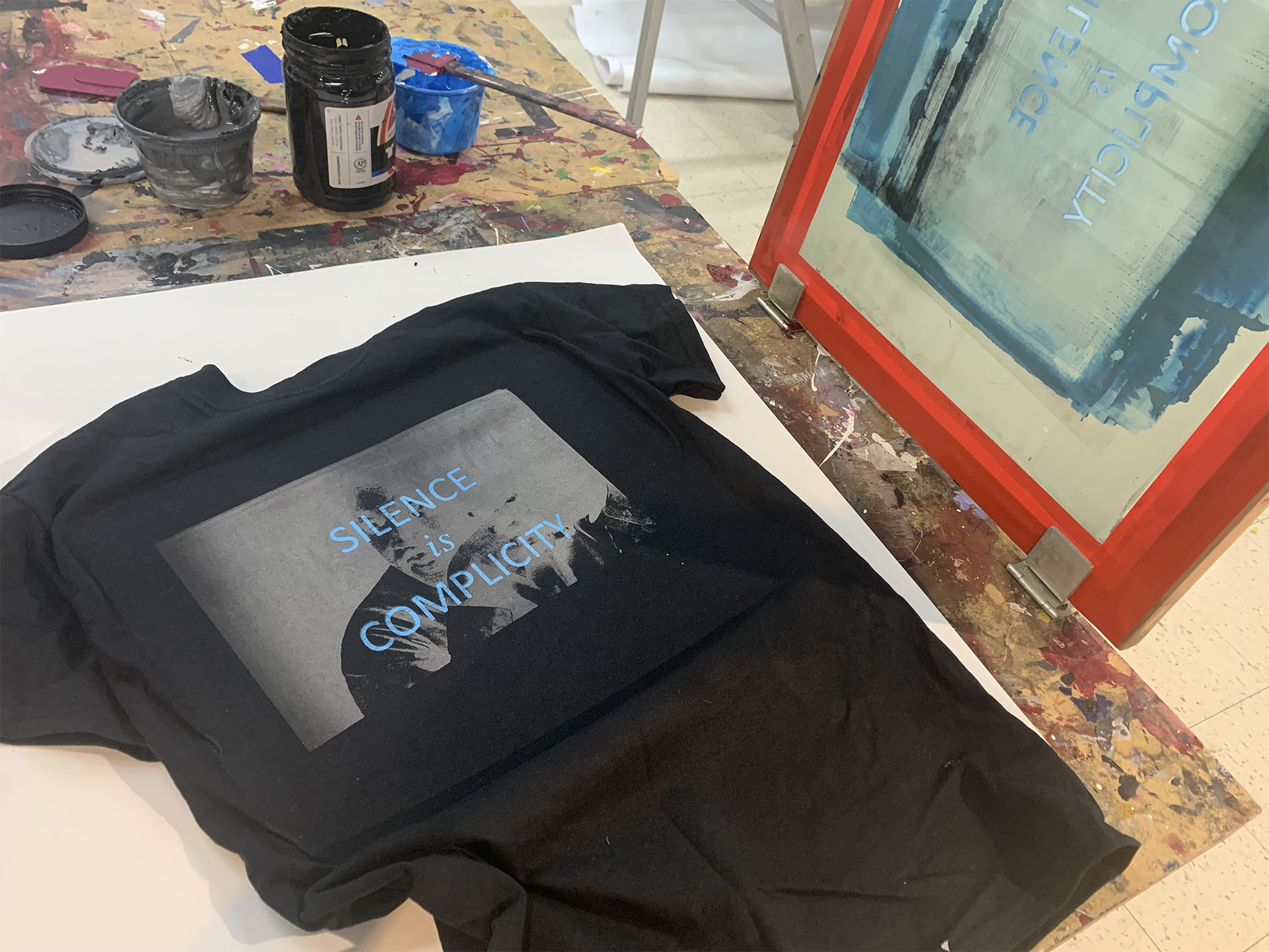 Screenprinting shirts for an MLK community open studio event where participants could choose from different images and quotes to print their own shirts