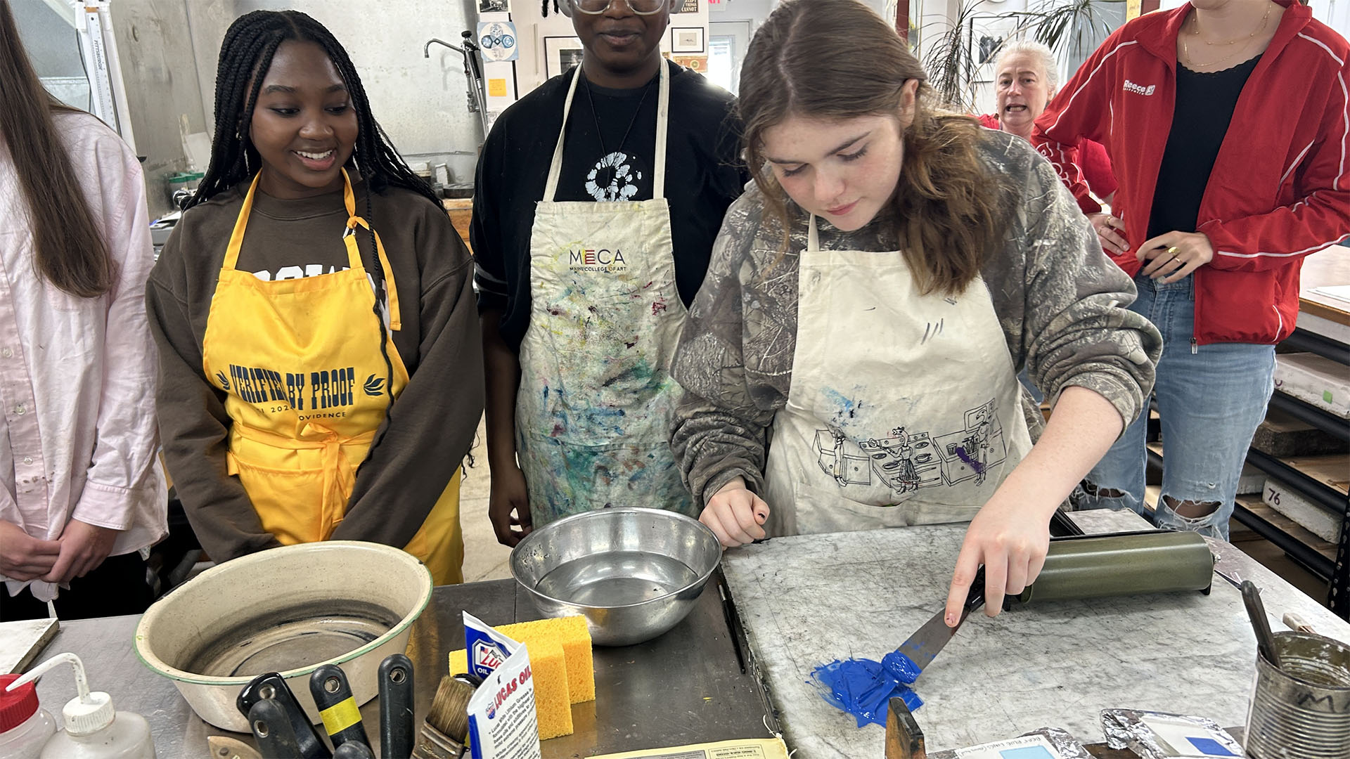 Printmaking class doing a full-day field trip to learn pronto plate litho at Muskat Studios in Somerville, MA with Carolyn Muskat