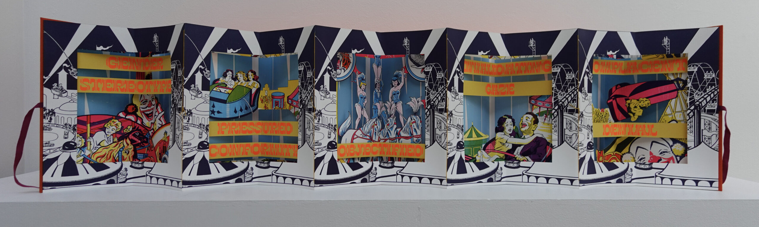 Bright, lurid ink colors evoke the spectacle and superficial cheer of circuses and amusement parks, while simultaneously reflecting the sensory and emotional overload many women face today. The aesthetic chaos parallels a broader cultural landscape in which civil rights are being eroded and definitions of gender and identity are increasingly constrained. By combining vintage imagery with modern context, the book challenges viewers to reflect on the persistent tensions between entertainment, objectification, and societal expectations of women.
